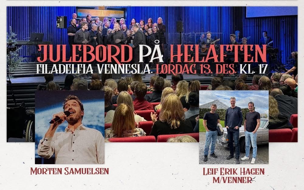 Det er en stor glede å invitere til det tradisjonsrike arrangementet «Julebord På Helaften» Filadelfia Vennesla lørdag 13. desember kl. 17. Kom gjerne tidlig, kaffe`n er klar fra dørene åpnes kl. 16.15.